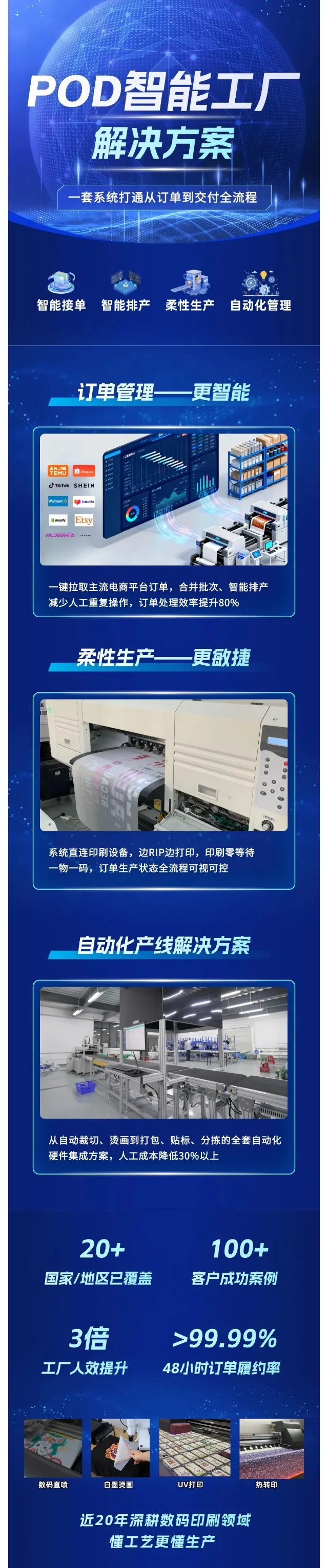 深耕POD行业多年,打造了一套完整的智能工厂解决方案,帮助工厂从传统制造向智能制造转型。